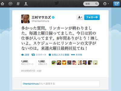 さまぁ~ず・三村、「リンカーン」終了にさみしい…番組内の企画でツイッターを開始の画像 「リンカーン」終了に心境を吐露した三村マサカズのツイッターアカウント - 画像はスクリーンショット この写真の記事を読む ADVERTISEMENT