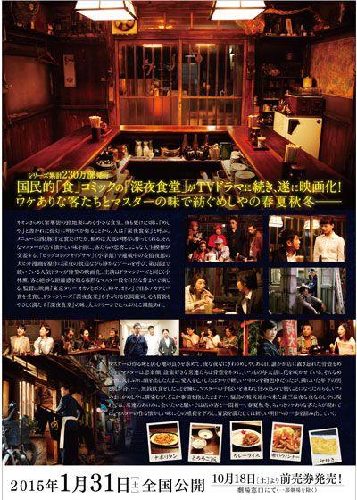 映画 深夜食堂 (2015):フォトギャラリー 2015年1月31日公開 119分 作品情報 映画短評 関連記事 予告編・動画 画像 チラシ - (C) 2015 安倍夜郎・小学館/映画「深夜食堂」製作委員会縦スクロールで次の画像 ADVERTISEMENT ポスター - (C) 2015 安倍夜郎・小学館/映画「深夜食堂」製作委員会 縦スクロールで次の画像 ADVERTISEMENT チラシ - (C) 2015 安倍夜郎・小学館/映画「深夜食堂」製作委員会 ADVERTISEMENT