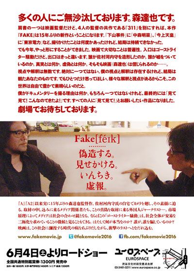 FAKE (2016):フォトギャラリー 2016年6月4日公開 109分 作品情報 映画短評 関連記事 予告編・動画 画像 チラシ - (C) 2016「Fake」製作委員会縦スクロールで次の画像 ADVERTISEMENT ポスター - (C) 2016「Fake」製作委員会 縦スクロールで次の画像 ADVERTISEMENT チラシ - (C) 2016「Fake」製作委員会 ADVERTISEMENT