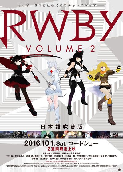 RWBY Volume 2 (2014):フォトギャラリー 2016年10月1日公開 154分 作品情報 予告編・動画 画像 ポスター - (C) 2016 Rooster Teeth Productions, LLC縦スクロールで次の画像 ADVERTISEMENT チラシ - (C) 2016 Rooster Teeth Productions, LLC 縦スクロールで次の画像 ADVERTISEMENT チラシ - (C) 2016 Rooster Teeth Productions, LLC ADVERTISEMENT