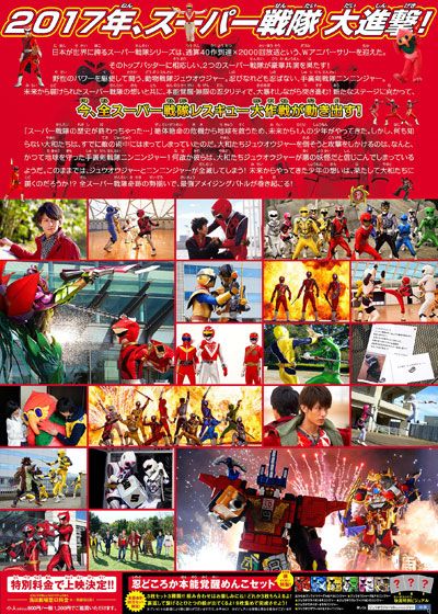 劇場版 動物戦隊ジュウオウジャーVSニンニンジャー 未来からのメッセージ from スーパー戦隊 (2017):フォトギャラリー 2017年1月14日公開 62分 作品情報 関連記事 予告編・動画 画像 チラシ - 「ジュウオウジャーVS ニンニンジャー」製作委員会 (C) 石森プロ・テレビ朝日・東映AG・東映縦スクロールで次の画像 ADVERTISEMENT ポスター - 「ジュウオウジャーVS ニンニンジャー」製作委員会 (C) 石森プロ・テレビ朝日・東映AG・東映 縦スクロールで次の画像 ADVERTISEMENT チラシ - 「ジュウオウジャーVS ニンニンジャー」製作委員会 (C) 石森プロ・テレビ朝日・東映AG・東映 ADVERTISEMENT