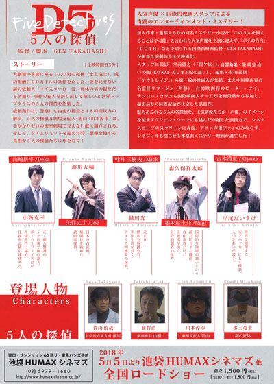 D5 5人の探偵 (2018):フォトギャラリー 2018年5月5日公開 93分 作品情報 予告編・動画 画像 チラシ - (C) チームD5/蓮都えるむ縦スクロールで次の画像 ADVERTISEMENT ポスター - (C) チームD5/蓮都えるむ 縦スクロールで次の画像 ADVERTISEMENT チラシ - (C) チームD5/蓮都えるむ ADVERTISEMENT