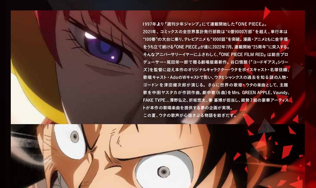 ONE PIECE FILM RED (2022):フォトギャラリー 2022年8月6日公開 115分 作品情報 映画短評 関連記事 予告編・動画 画像 チラシ - (C) 尾田栄一郎/2022「ワンピース」製作委員会縦スクロールで次の画像 ADVERTISEMENT ポスター - (C) 尾田栄一郎/2022「ワンピース」製作委員会 縦スクロールで次の画像 ADVERTISEMENT ポスター - (C) 尾田栄一郎/2022「ワンピース」製作委員会 縦スクロールで次の画像 ADVERTISEMENT チラシ - (C) 尾田栄一郎/2022「ワンピース」製作委員会 ADVERTISEMENT