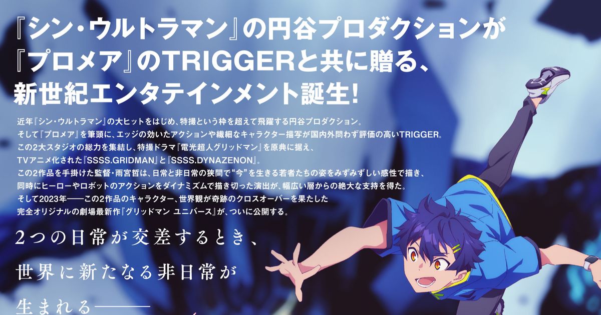 グリッドマン ユニバース (2023):フォトギャラリー 2023年3月24日公開 118分 作品情報 関連記事 予告編・動画 画像 チラシ - (C) 円谷プロ (C) 2023 TRIGGER・雨宮哲/「劇場版グリッドマンユニバース」製作委員会縦スクロールで次の画像 ADVERTISEMENT ポスター - (C) 円谷プロ (C) 2023 TRIGGER・雨宮哲/「劇場版グリッドマンユニバース」製作委員会 縦スクロールで次の画像 ADVERTISEMENT ポスター - (C) 円谷プロ (C) 2023 TRIGGER・雨宮哲/「劇場版グリッドマンユニバース」製作委員会 縦スクロールで次の画像 ADVERTISEMENT ポスター - (C) 円谷プロ (C) 2023 TRIGGER・雨宮哲/「劇場版グリッドマンユニバース」製作委員会 縦スクロールで次の画像 ADVERTISEMENT チラシ - (C) 円谷プロ (C) 2023 TRIGGER・雨宮哲/「劇場版グリッドマンユニバース」製作委員会 ADVERTISEMENT