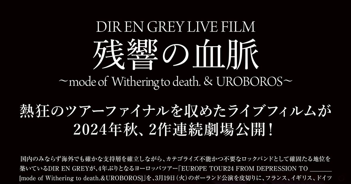 DIR EN GREY LIVE FILM 残響の血脈 ~mode of Withering to death.~ (2024):フォトギャラリー 2024年9月20日公開 113分 作品情報 予告編・動画 画像 チラシ - (C) FW縦スクロールで次の画像 ADVERTISEMENT ポスター - (C) FW 縦スクロールで次の画像 ADVERTISEMENT チラシ - (C) FW ADVERTISEMENT