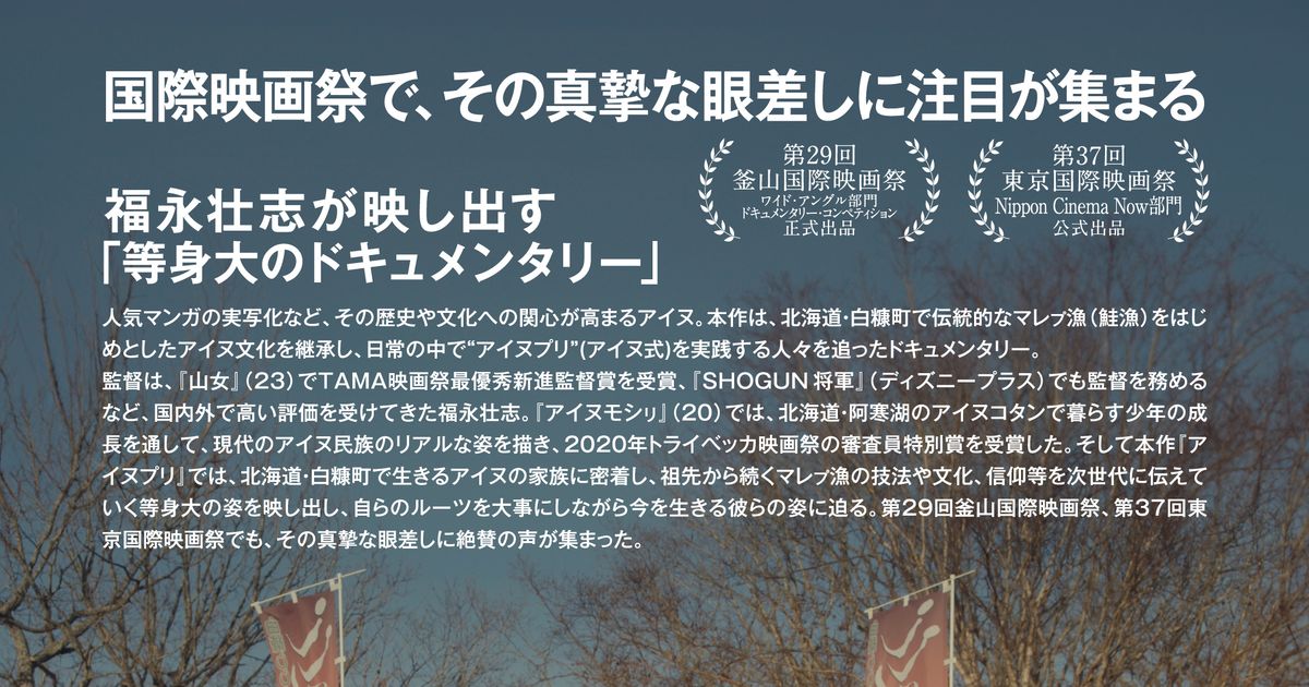 アイヌプリ (2024):フォトギャラリー 2024年12月14日公開 82分 作品情報 関連記事 予告編・動画 画像 チラシ - (C) 2024 Takeshi Fukunaga / AINU PURI Production Committee縦スクロールで次の画像 ADVERTISEMENT ポスター - (C) 2024 Takeshi Fukunaga / AINU PURI Production Committee 縦スクロールで次の画像 ADVERTISEMENT チラシ - (C) 2024 Takeshi Fukunaga / AINU PURI Production Committee ADVERTISEMENT