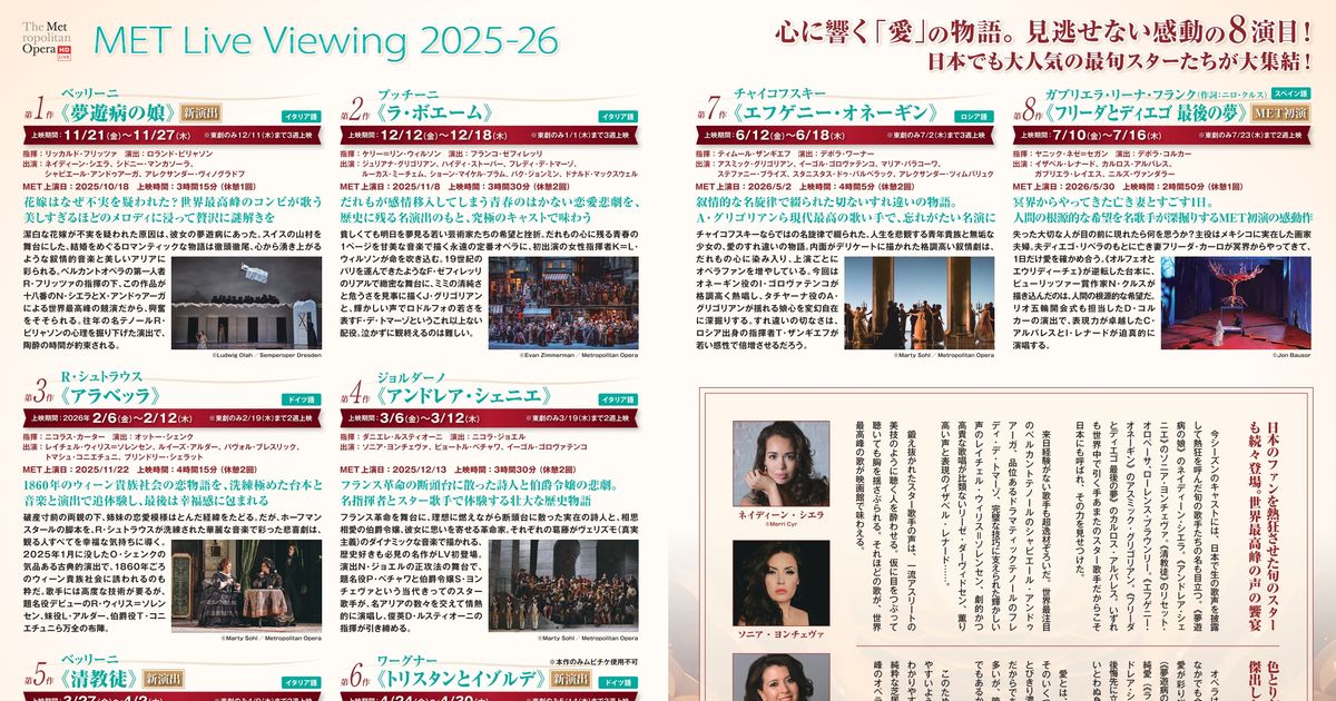 METライブビューイング2025-26/ワーグナー《トリスタンとイゾルデ》:フォトギャラリー 2026年4月24日公開 315分 作品情報 画像 チラシ - (C) Paola Kudacki / Metropolitan Opera縦スクロールで次の画像 ADVERTISEMENT ポスター - (C) Paola Kudacki / Metropolitan Opera 縦スクロールで次の画像 ADVERTISEMENT チラシ - (C) Paola Kudacki / Metropolitan Opera ADVERTISEMENT
