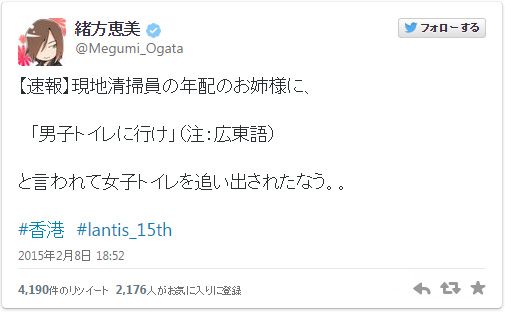 現地時間7日と8日に行われた「Lantis Festival 2015 HONG KONG」公演のため香港に滞在していた緒方。現地の様子やライブの盛り上がりをツイッターで報告する中、「【速報】」と題したつぶやきで、「現地清掃員の年配のお姉様に、『男子トイレに行け』(注:広東語)と言われて女子トイレを追い出されたなう。。」と報告した。