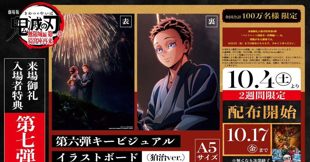 特典のイラストボードは、表面に第6弾キービジュアル、裏面には狛治の表情をクローズアップしたイラストがデザインされた両面仕様のA5サイズ。配布は10月4日から10月17日までの2週間限定で、全国合計100万名にプレゼントされる。