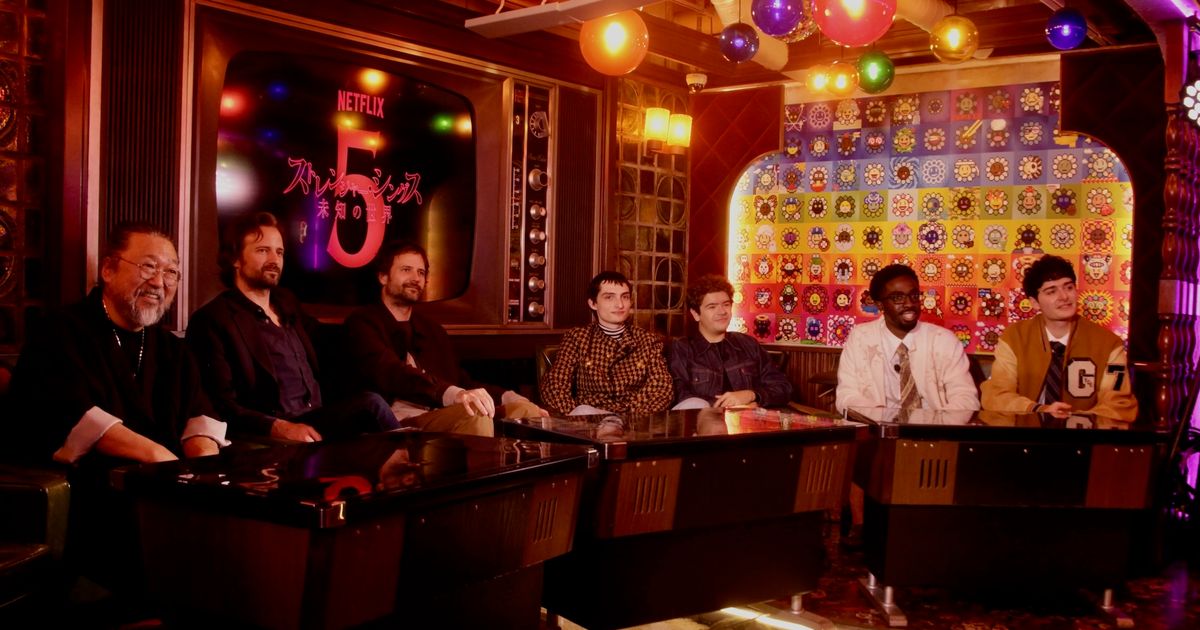 Netflixの人気ドラマシリーズ「ストレンジャー・シングス 未知の世界」の完結編となるシーズン5を手掛けた、兄弟監督のマット・ダファーとロス・ダファーが21日、東京・中野ブロードウェイの「純喫茶ジンガロ」を、本作に出演するフィン・ヴォルフハルト(マイク役)、ゲイテン・マタラッツォ(ダスティン役)、ケイレブ・マクロクリン(ルーカス役)、ノア・シュナップ(ウィル役)と共に訪れ、アーティストの村上隆と対面。最新作について「シリーズ最高傑作になるような気がします」と絶賛されて感激の表情を浮かべた。