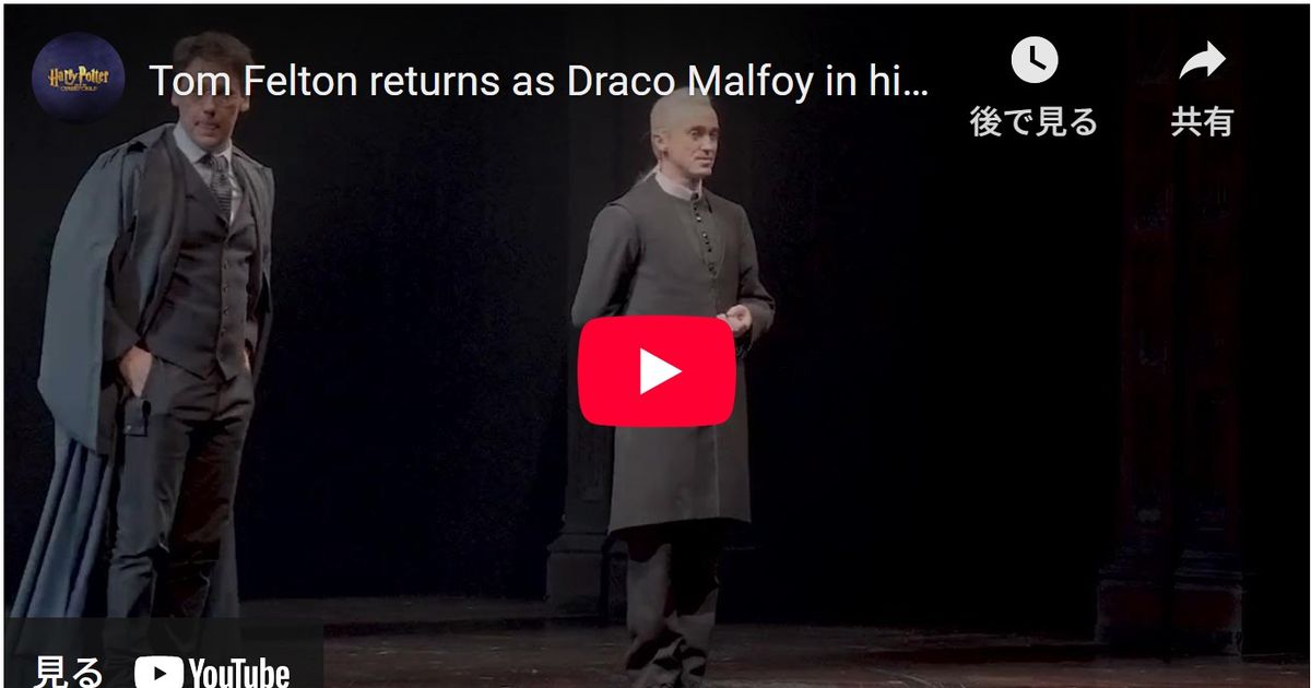 映画『ハリー・ポッター』シリーズで主人公ハリーをライバル視するドラコ・マルフォイ役を務めたトム・フェルトン(38)が、再び同役を、今度はブロードウェイの舞台「ハリー・ポッターと呪いの子」で演じている。現地時間11日がトムにとっての初日。その初登場シーンでは、観客が実に30秒以上の大歓声・スタンディングオベーションでドラコの帰還を祝福した。
