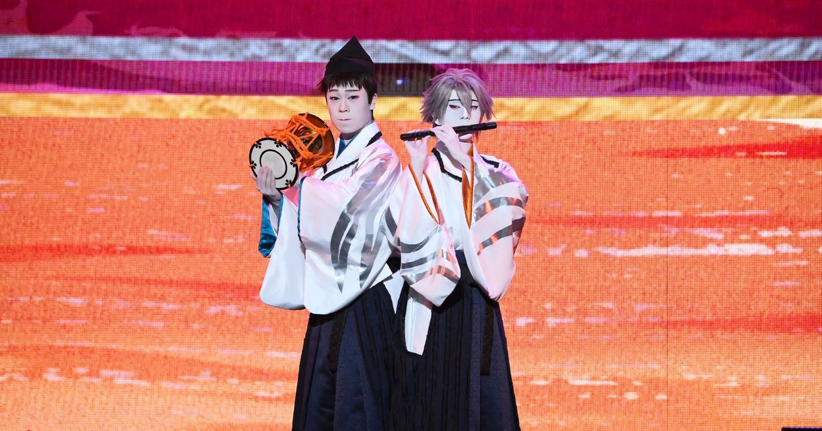 「《第一楽章》漆黒の彼方『儀式的な始まりと、雅楽の奏楽』」では、尾上が登場するなり拍手が沸き起こる。舞台は「《第二楽章》白き月『和楽器のコンテンポラリー』」「《第三楽章》紅海波『能楽風のストイックな演奏』」「《第四楽章》群青『三味線を聞かせ、最後は和楽器、全部盛』」の四部構成からなり、和に装飾されたカヲルの美しさ、シンジとの対比の演出はもちろん、幻想的な音楽と舞踊にファンは真剣に見入っていた。