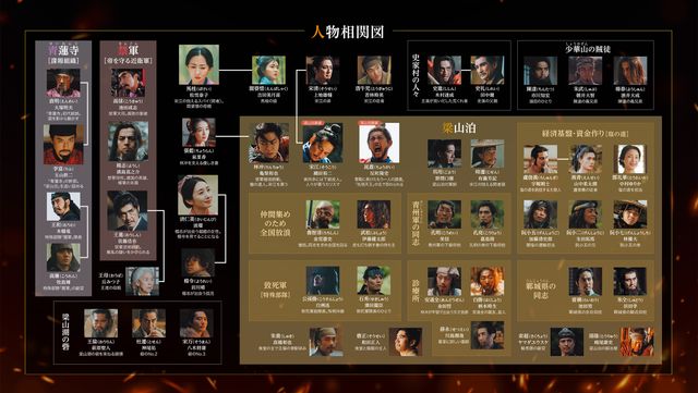 個性豊かなキャラクターを演じるのは、やはり全員主役級の超豪華キャスト。彼らが演じる各分野のプロフェッショナルたちの戦いも大きな見どころ。相関図でそれぞれのキャラクターの背景を知ることで、物語への没入感は一気に高まるはず。さらに梁山泊の勢力毎に主要キャラクターを見てみよう。きっと自分だけの推しキャラが見つかるはず!